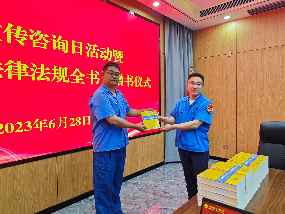 6月28日,公司舉辦安全生產(chǎn)月“安全宣傳咨詢?nèi)栈顒郁摺栋踩a(chǎn)法律法規(guī)全書》贈書儀式”,收集并回答干部員工關(guān)于安全生產(chǎn)的問題,為各部門贈送安全法規(guī)書籍。