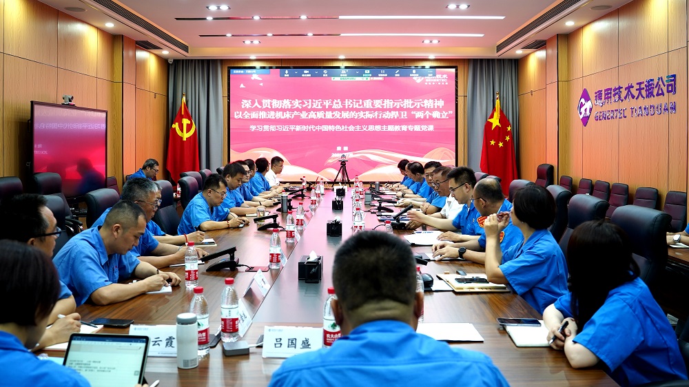 7月17日上午,集團總工程師,機床公司董事長、黨委書記唐毅以《深入貫徹落實習(xí)近平總書記重要指示批示精神 以全面推進機床產(chǎn)業(yè)高質(zhì)量發(fā)展的實際行動捍衛(wèi)“兩個確立”》為主題講授主題教育專題黨課。專題黨課的主會場設(shè)在天鍛公司小淀廠區(qū),采用線上線下相結(jié)合的方式進行。集團主題教育第四指導(dǎo)組副組長吳越視頻參會指導(dǎo)。天鍛公司黨委書記、董事長劉國福主持會議。